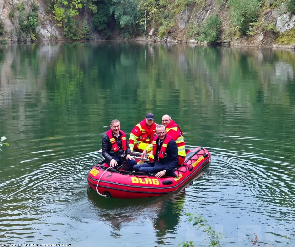 Landrat Berek und OB Pötzsch ließen es sich nicht nehmen, selbst die Schwimmwesten anzulegen und das Gerät direkt auf unserem Boot im Einsatz zu erleben!